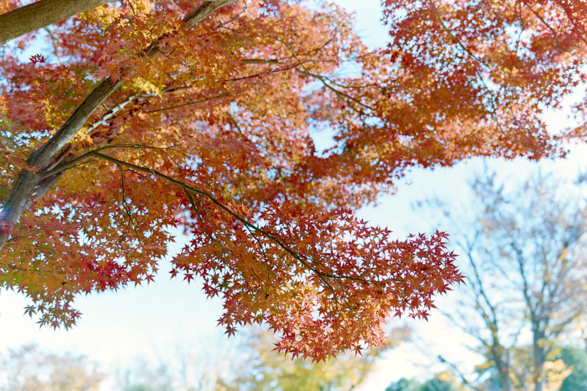 駐車場で良い感じの紅葉の木があったので、車が画角に入らないように下から撮影しました。
